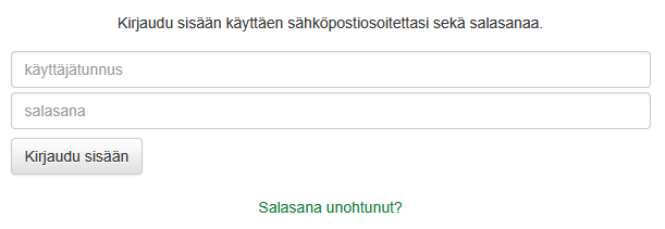 Jos olet unohtanut salasanasi, niin voit vaihtaa uuden salasanan kirjautumisnäkymän "Salasana unohtunut?" linkin kautta (vihreä linkki kirjautumisnäkymässä).