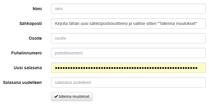 Voit vaihtaa käyttäjätunnuksen kirjautumalla Reviiri palveluun ja valitsemalla oikean yläkulman kuvakkeen kautta "Omat tiedot" -> kirjoita vanhan sähköpostiosoitteesi tilalle uusi sähköpostiosoite ja valitse sitten: "Tallenna muutokset".