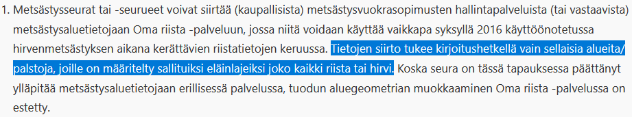 "Oma riista -yhteensopiva" ("Tietojen siirto tukee kirjoitushetkellä vain sellaisia alueita/palstoja, joille on määritelty sallituiksi eläinlajeiksi, joko kaikki riista tai hirvi").