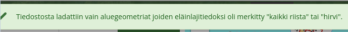 Alueita Oma Riista palveluun vietäessä Reviiri palvelun käyttäjälle näkyy ilmoitus "Tiedostosta ladattiin vain aluegeometriat joiden eläintietolajiksi on merkitty "kaikki riista" tai "hirvi".